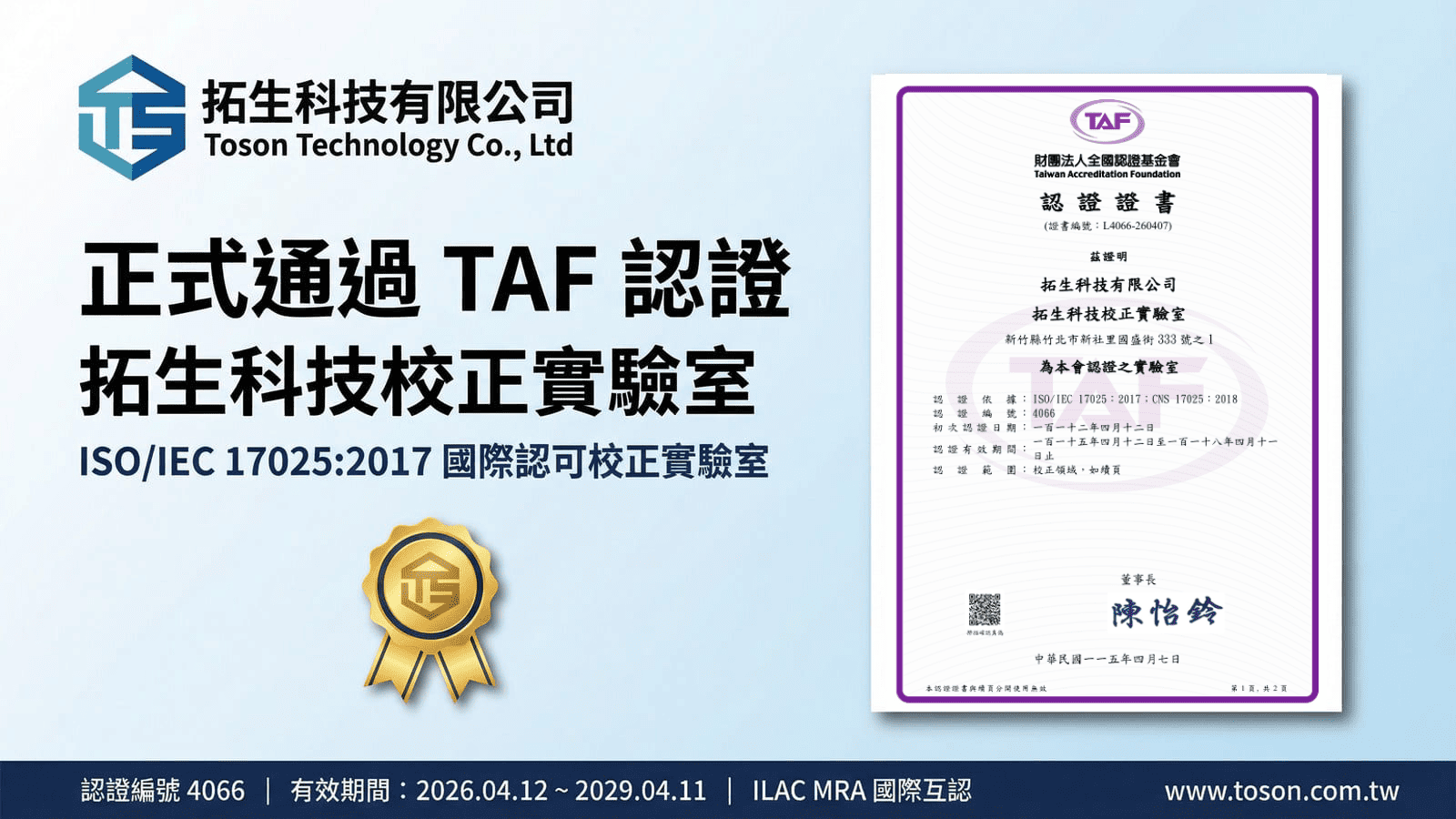 我們非常榮幸地宣布,拓生科技校正實驗室已於 2026 年 4 月再次通過 TAF 嚴格審查,成功取得認證展延(證書編號:L4066-260407)!💯