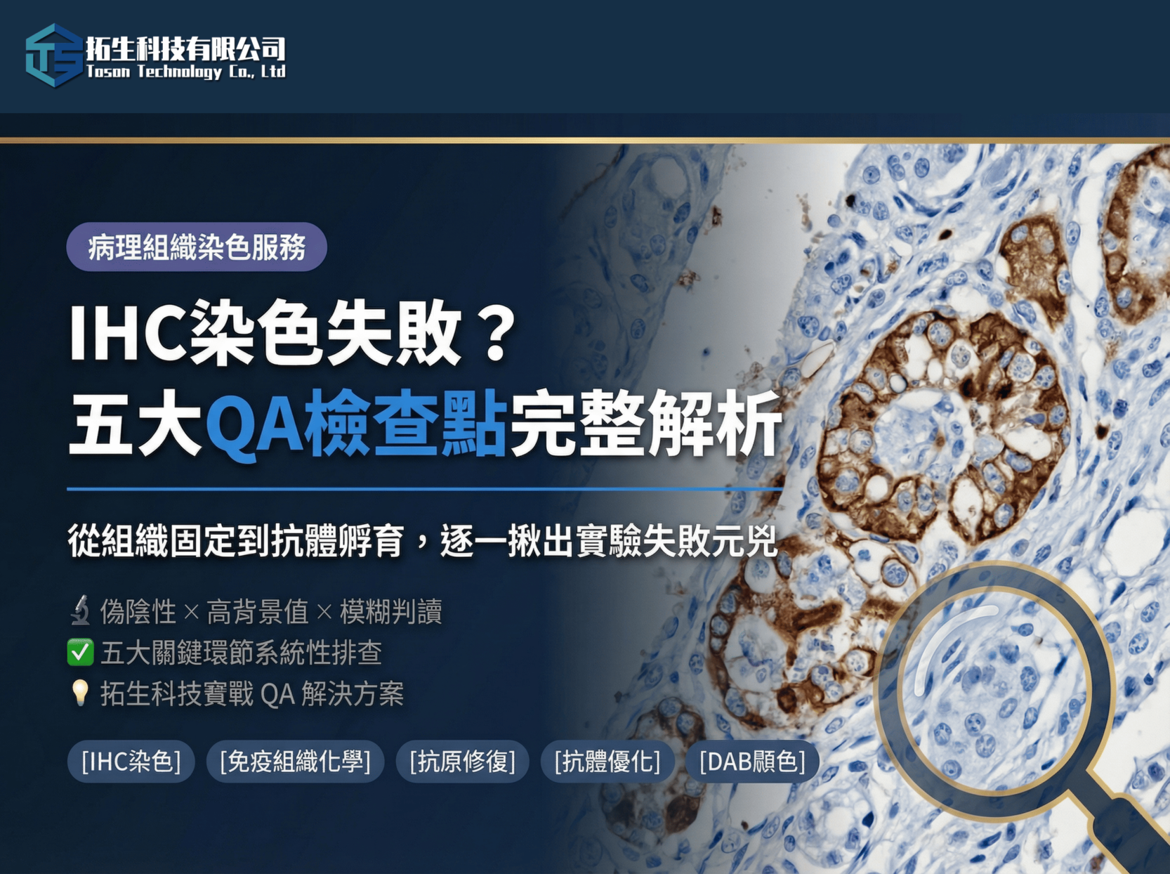 免疫組織化學染色(Immunohistochemistry, IHC)是現代病理診斷與生命科學研究中不可或缺的技術。然而,儘管流程已標準化,許多研究人員仍常面臨「染色結果不如預期」的挫折。常見的問題包括:該染的地方沒染出來(偽陰性)、不該染的地方滿片通紅(背景過高),或是染色訊號斷斷續續。