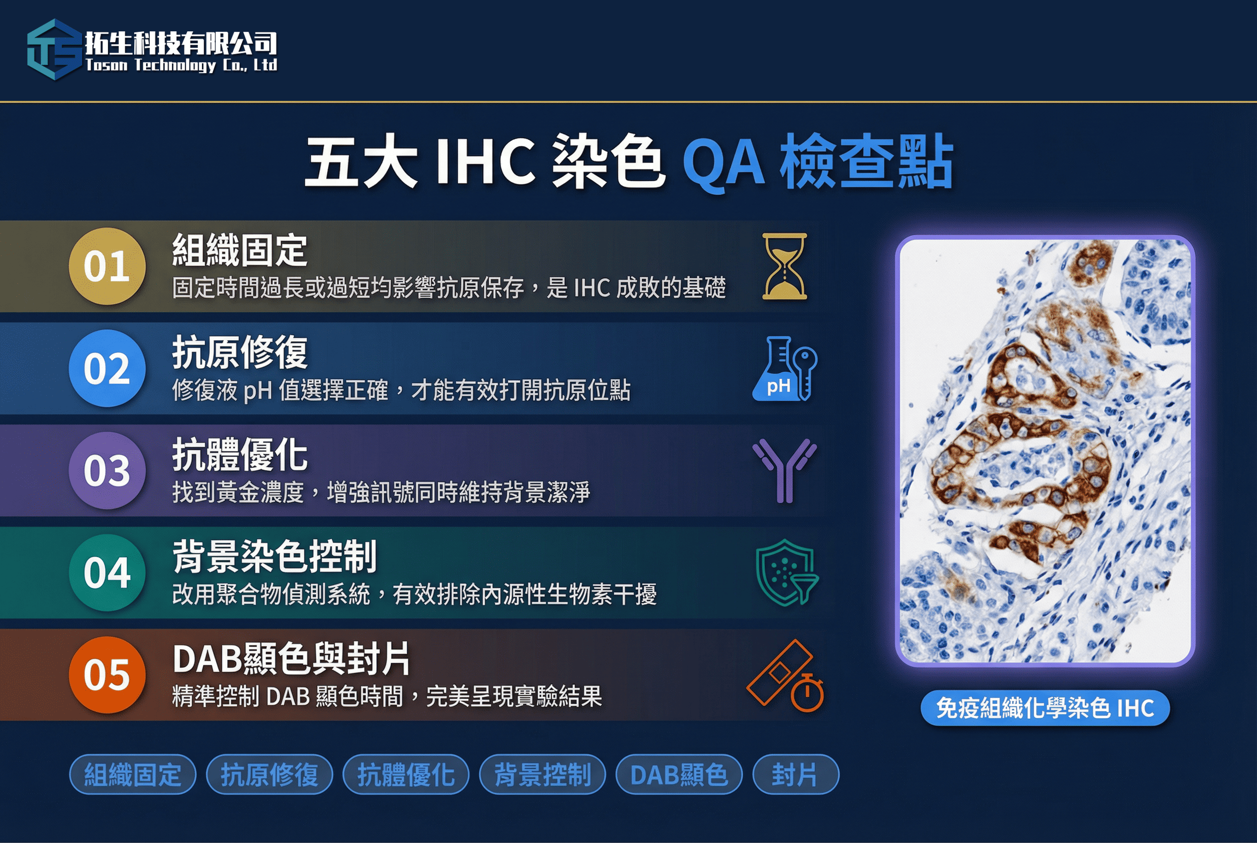 請參考拓生科技部落格文章:拓生科技免疫染色代工服務與高解析度全景掃描、IHC/ISH套組實用推薦、硬骨切片技術五步驟