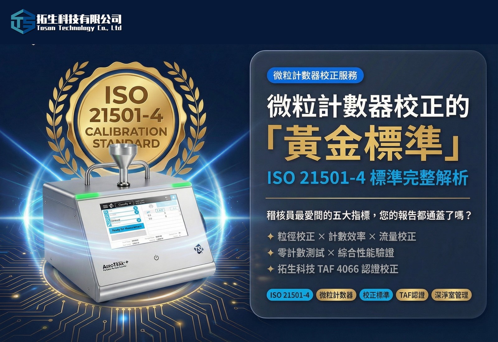 這套標準的核心目標,在於確保不同品牌、不同型號的光散射空氣微粒計數器(LSAPC),在「判讀粒徑」與「計算數量」上具備一致性與可比較性,從而大幅降低因儀器差異所導致的判讀風險。本文將為您深入拆解 ISO 21501-4 的核心要求,並說明拓生科技如何透過 TAF 認證校正服務(編號 4066) 為您的數據公信力提供堅實後盾。