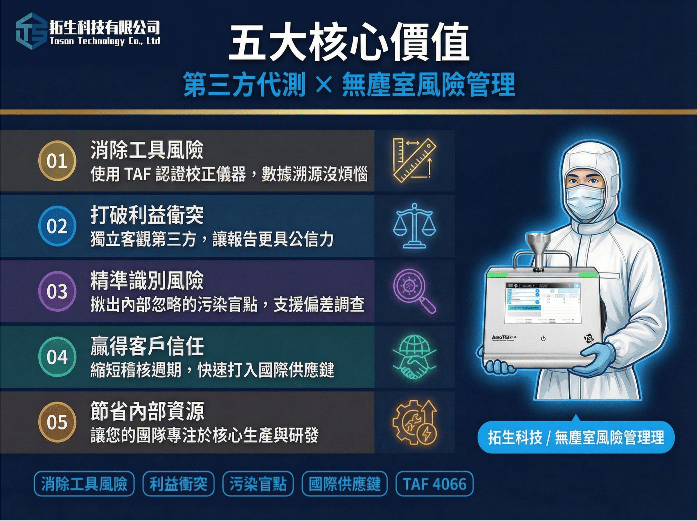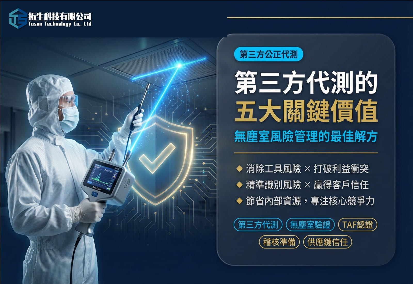 無塵室管理的終極目標,是讓數據能夠支撐決策、通過稽核並有效降低營運風險。第三方公正代測所提供的,正是在關鍵時刻,那份最重要且「可被承認的信任」。若您正在為即將到來的稽核做準備,或希望建立更穩固的品質管理系統,歡迎聯繫拓生科技,讓我們為您規劃最專業的第三方代測服務。