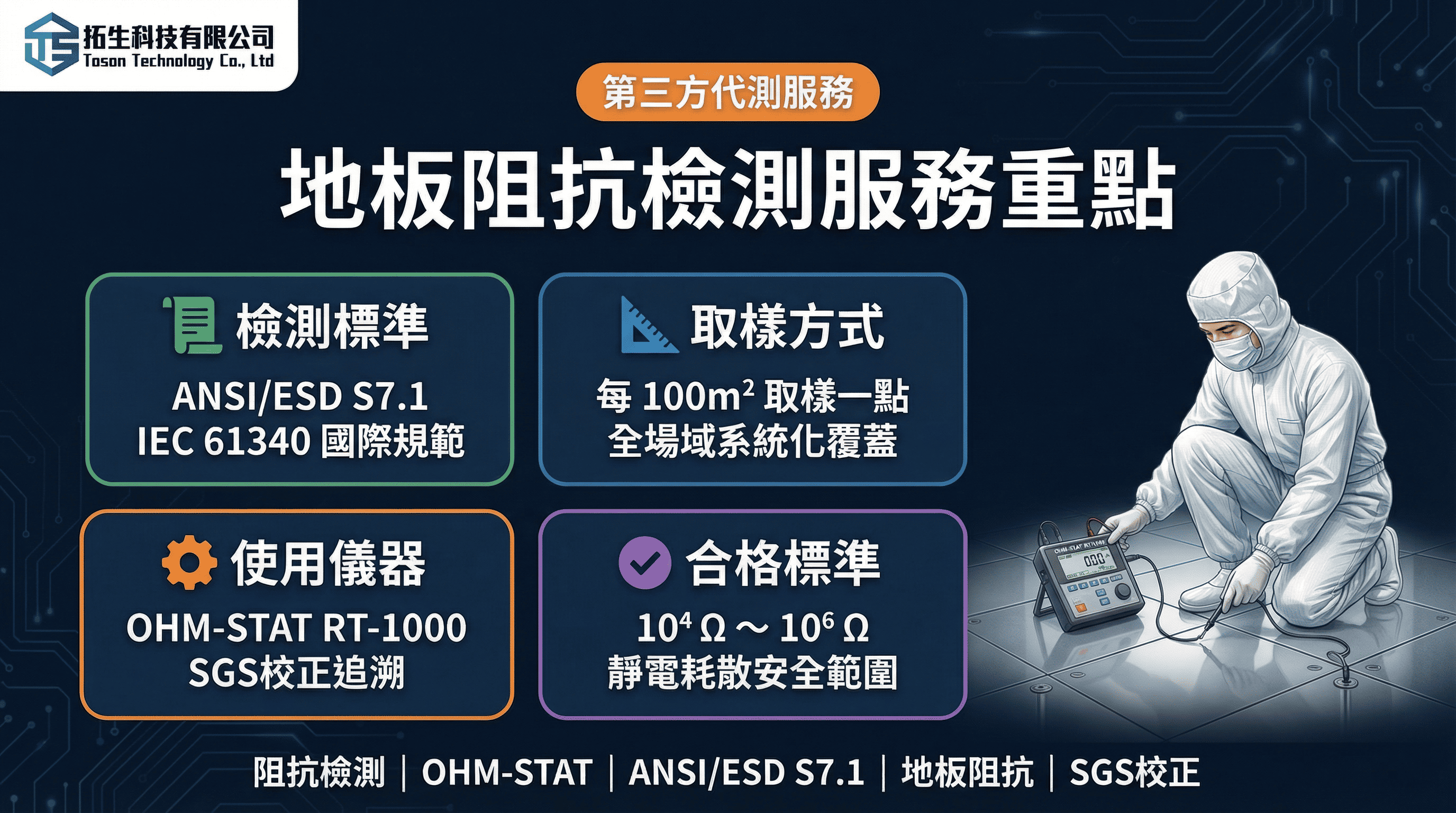 - 檢測工具: 使用如 OHM-STAT RT-1000 等專業表面阻抗計,搭配兩顆各 5 磅的標準重錘電極 。