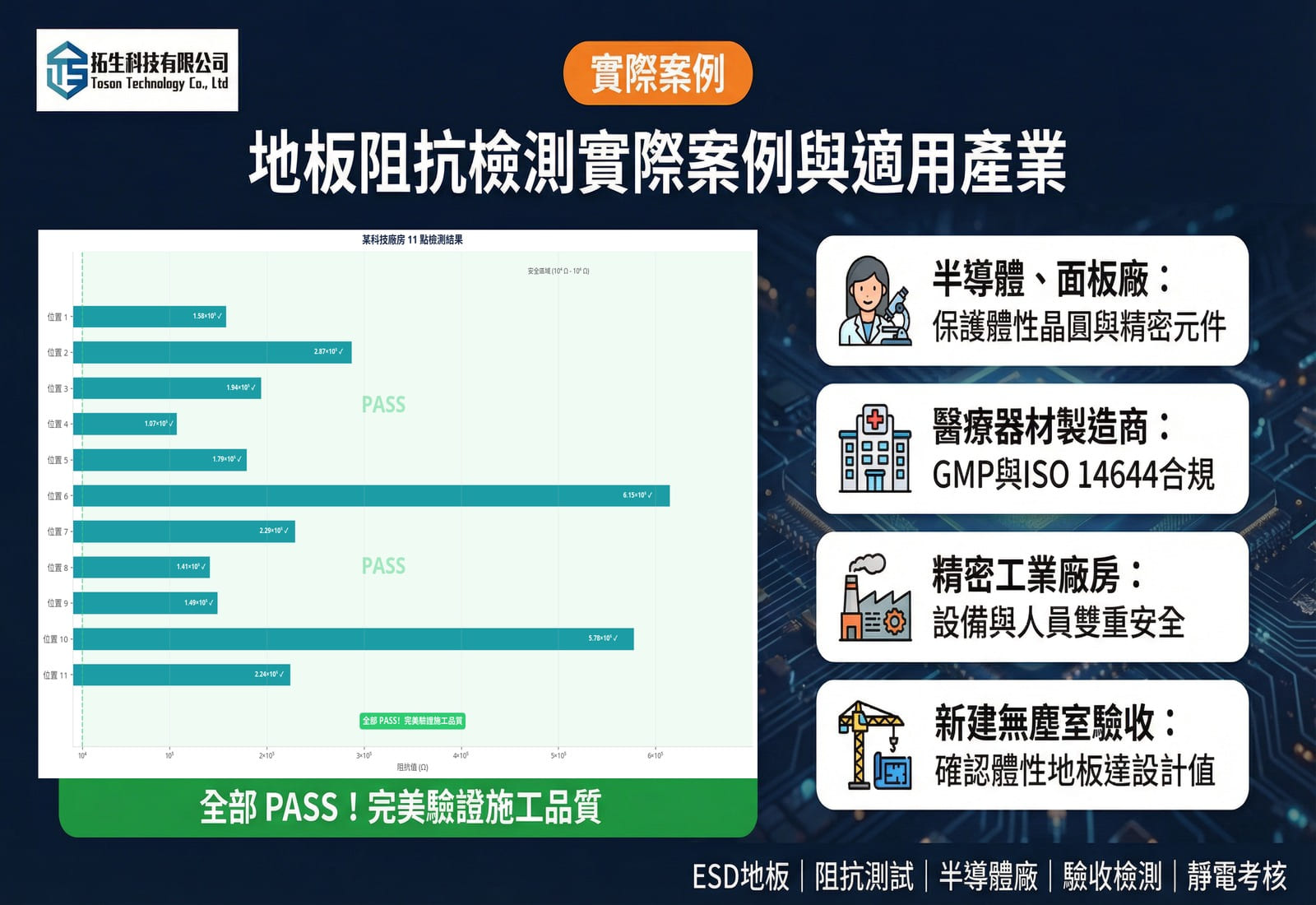 - 實測案例: 在某知名科技廠房的實測中,透過施加 10 V 或 100 V 的測試電壓,測得點位阻抗穩定於 1.07×10⁵ Ω 至 6.15×10⁵ Ω 之間,證明其導電網路布建均勻,完全符合工程規範 。