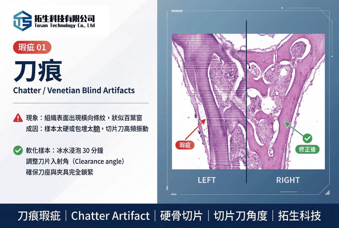 - 成因: 這通常是因為硬骨樣本「太硬」或「包埋太脆」,導致切片刀在經過樣本時產生高頻振動。