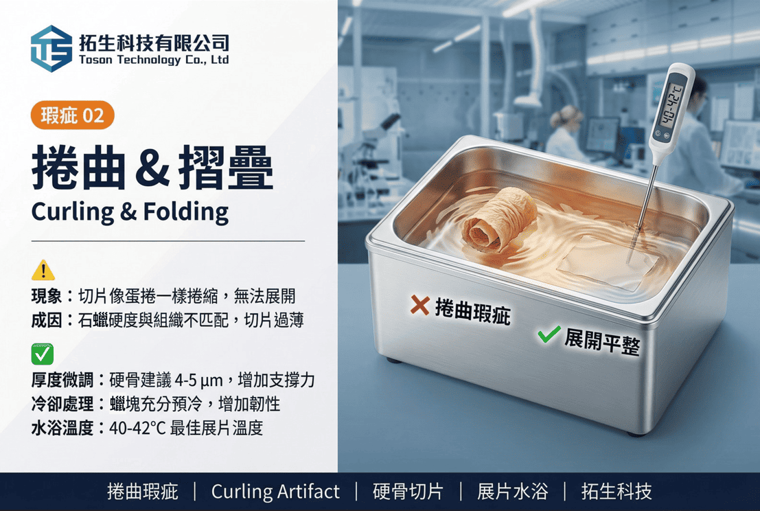 - 現象: 切下來的薄片像蛋捲一樣捲縮,無法平整地展開在水浴中。