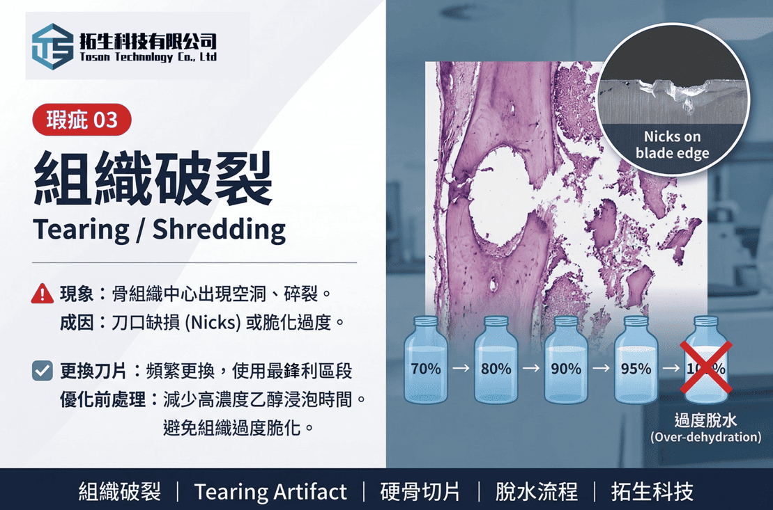 - 成因: 包埋石蠟的硬度與組織不匹配,或切片厚度設定過薄(例如硬骨設定為 2 µm)。