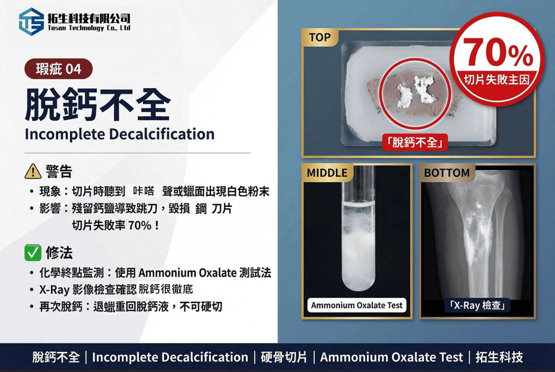 硬骨切片失敗的原因中,有 70% 來自於「脫鈣不足(Incomplete Decalcification)」。