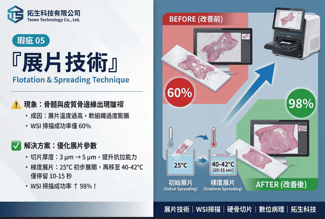 - 效果: 調整後,切片平整度提升,WSI 掃描的一次成功率從 60% 提高至 98%,且組織邊界清晰,無人為假象。