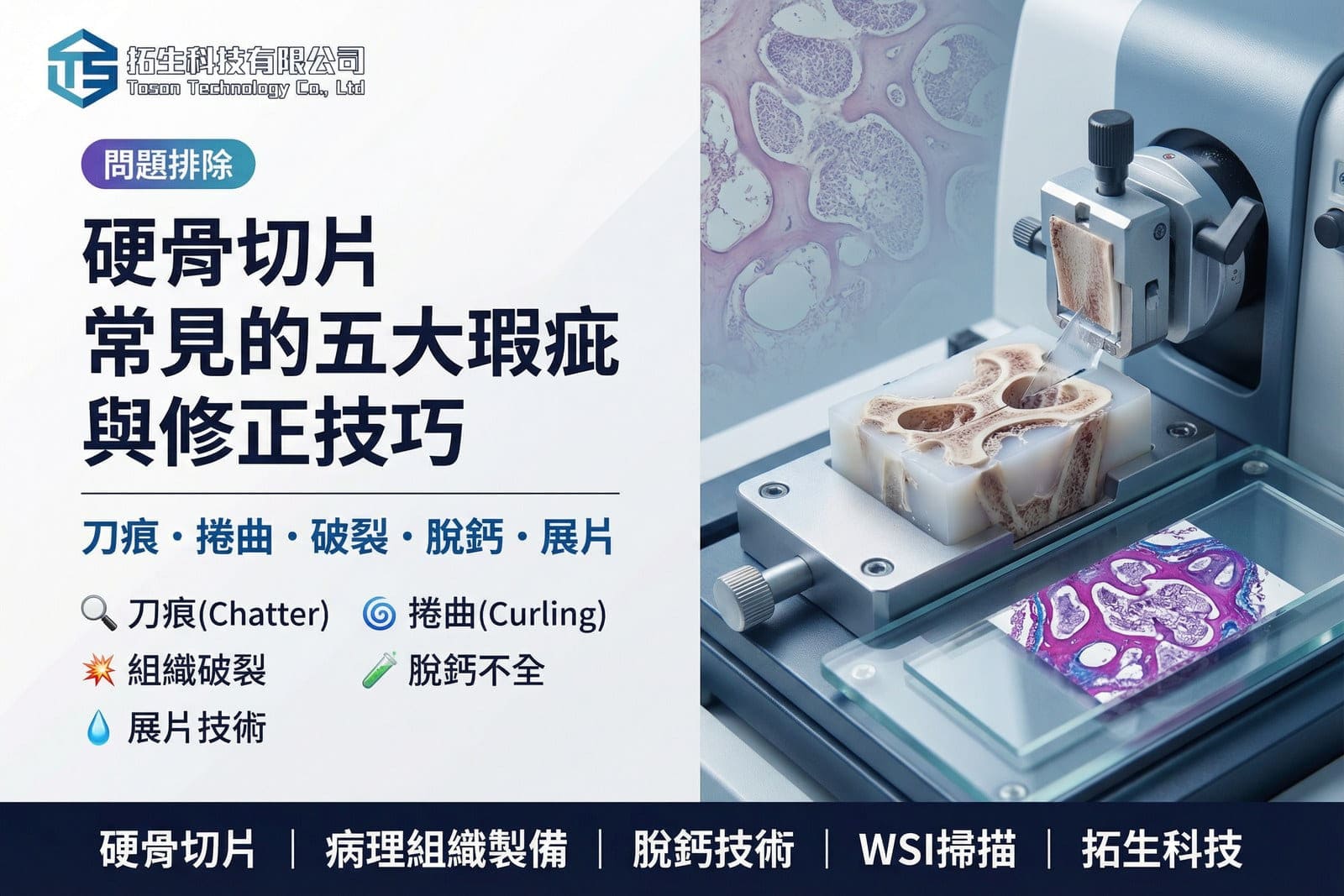 作為拓生科技的內容行銷專員,我們深知一張完美的硬骨切片是數位病理與 AI 定量分析的先決條件。本文將針對硬骨切片最常出現的五大瑕疵進行深度解析,並提供具體的修正建議。