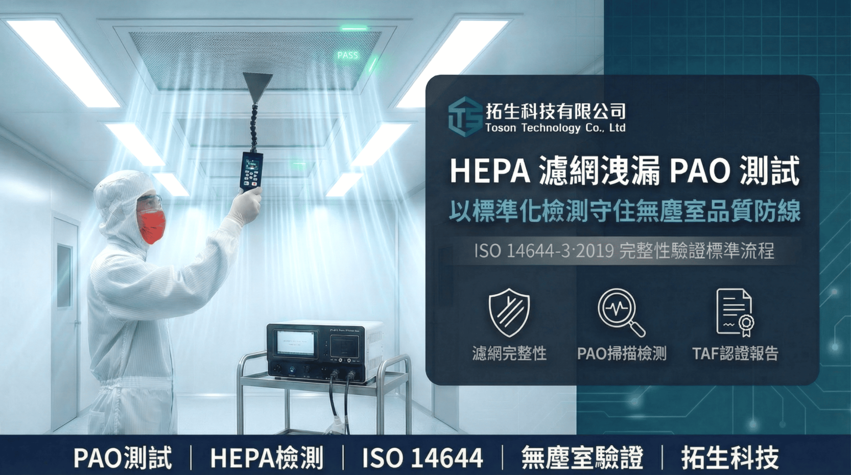 - HEPA 濾網洩漏 PAO 測試: 嚴格遵循 ISO 14644 標準,提供具備可追溯性的專業報告 。