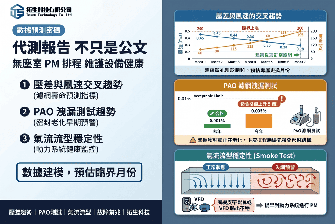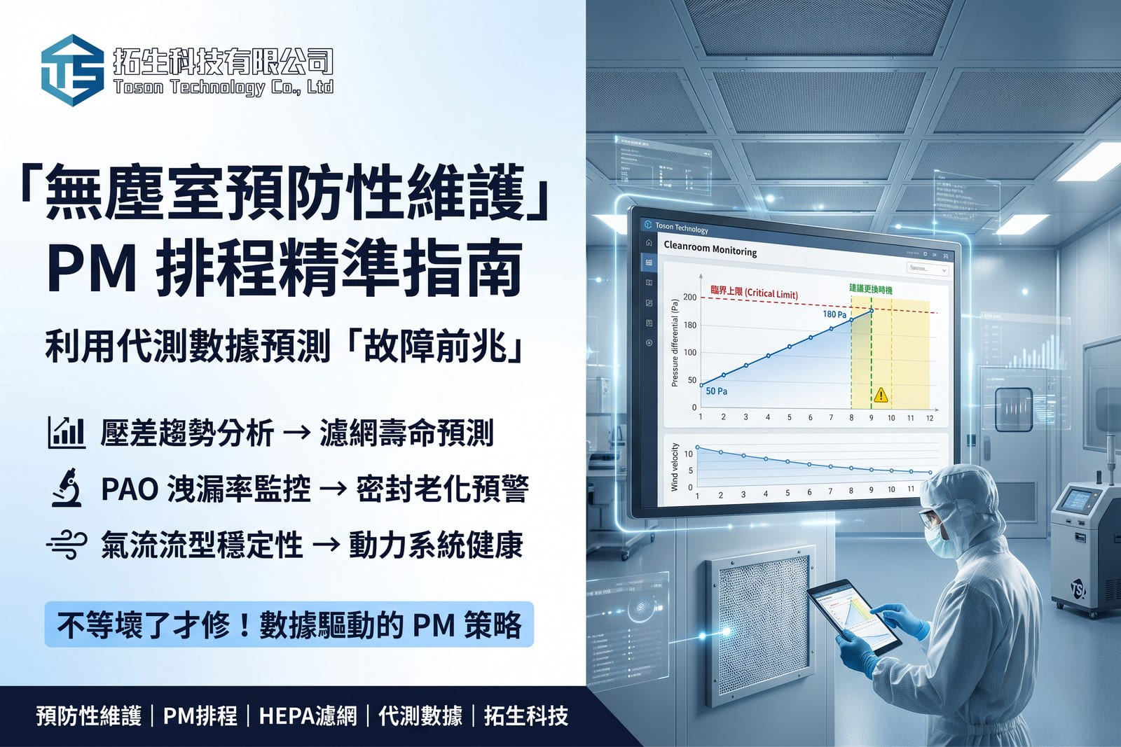 然而,真正的一流廠房採用的是預防性維護(Preventive Maintenance, PM)。PM 的核心不再是「壞了才修」,而是透過定期的第三方代測數據進行深度分析,找出設備效能下滑的曲線。今天,拓生科技將揭秘如何將看似枯燥的檢測數據,轉化為守護產能的「預言書」。