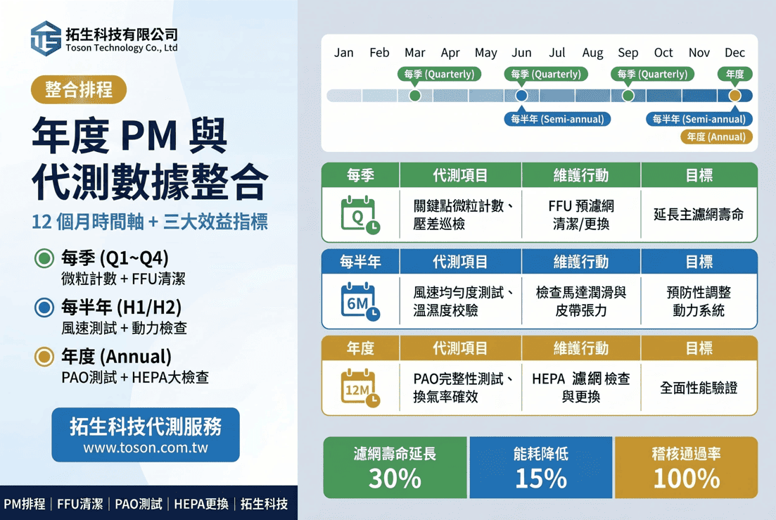| 年度 | PAO 完整性測試、換氣率確效 | HEPA 濾網大檢查與更換 | 全面性能驗證,應對外部稽核。 |