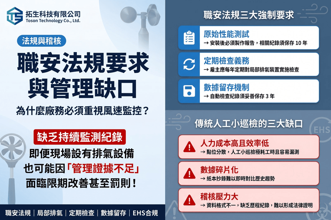 若缺乏持續且具備時間戳記的監測紀錄,即便現場設有排氣設備,一旦面臨勞檢或異常事件追查,往往會因「管理證據不足」而面臨限期改善甚至罰則 。
