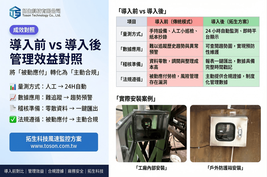 拓生科技針對上述痛點,協助某廠房導入了以 24小時監控並記錄之風速計 為核心的數位監控方案,將「單次量測」升級為「連續式資料管理」 。