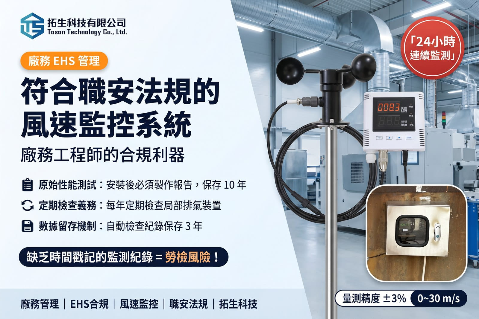 風速與風量監控是廠務與專案經理維持製程穩定與法規合規的第一道門口 。透過拓生科技的監控方案,您不僅能提升作業環境安全性,更能有效將管理數據制度化,將職安風險降至最低 。