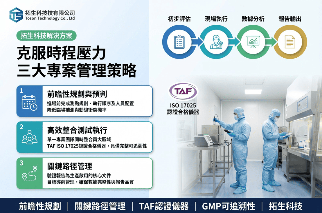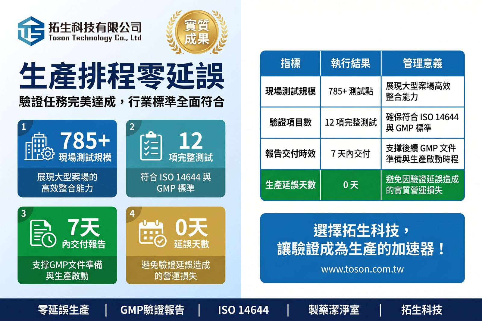 透過無塵室全面驗證流程(初步評估、執行、分析、輸出),拓生科技將「驗證報告」視為生產啟用的核心文件,而非測試後的附屬品 。這種目標導向的管理方式,確保了在高壓環境下仍能維持數據的完整性與報告品質 。