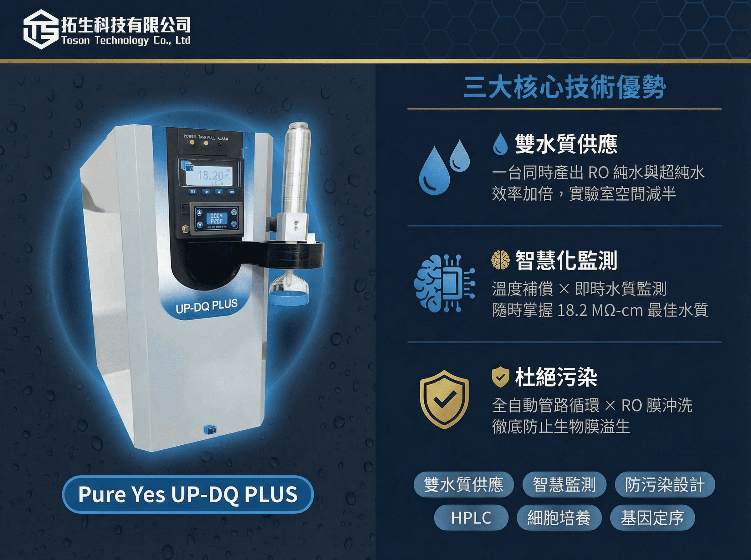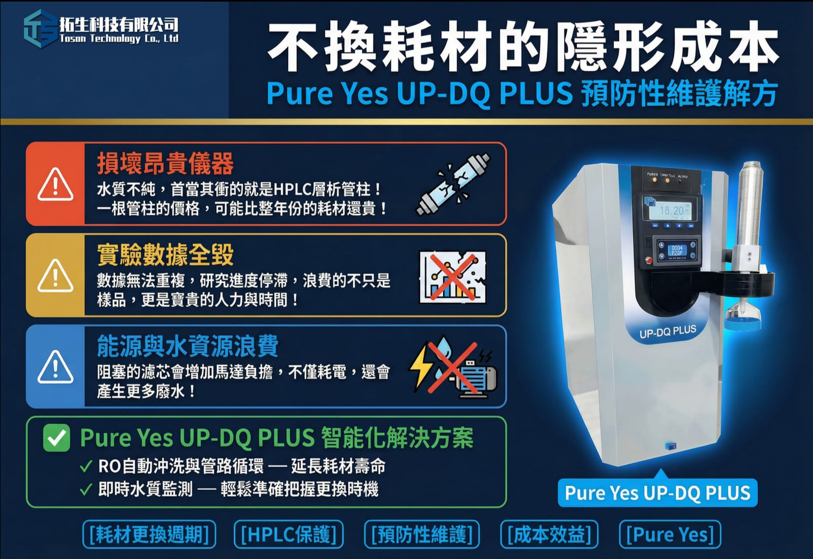 選購實驗室設備時,精明的管理者看的不應只是「初期採購價格」,而是更全面的「長期持有成本」。拓生科技提供的 UP-DQ PLUS 超純水系統,正是透過優化的濾材配置與智能化的保護機制,有效延長了單一耗材的使用壽命,幫助您的實驗室在追求頂尖科研成果的同時,也能實現最優化的成本效益。