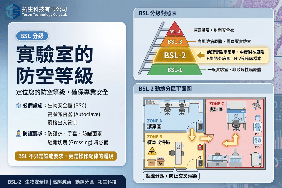BSL 等級不僅是設施的要求,更是操作紀律的體現。在拓生科技協助客戶規劃實驗室時,我們會特別強調「動線分區」——將潔淨區、樣本收件區與處理區嚴格區隔,避免病原體透過人流交叉汙染。