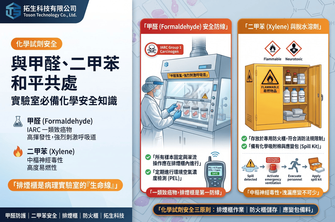 病理實驗室最常接觸的化學品——甲醛(Formaldehyde)與二甲苯(Xylene),雖然是製備優質切片的必備試劑,但也具備高揮發性、致癌性與易燃性。