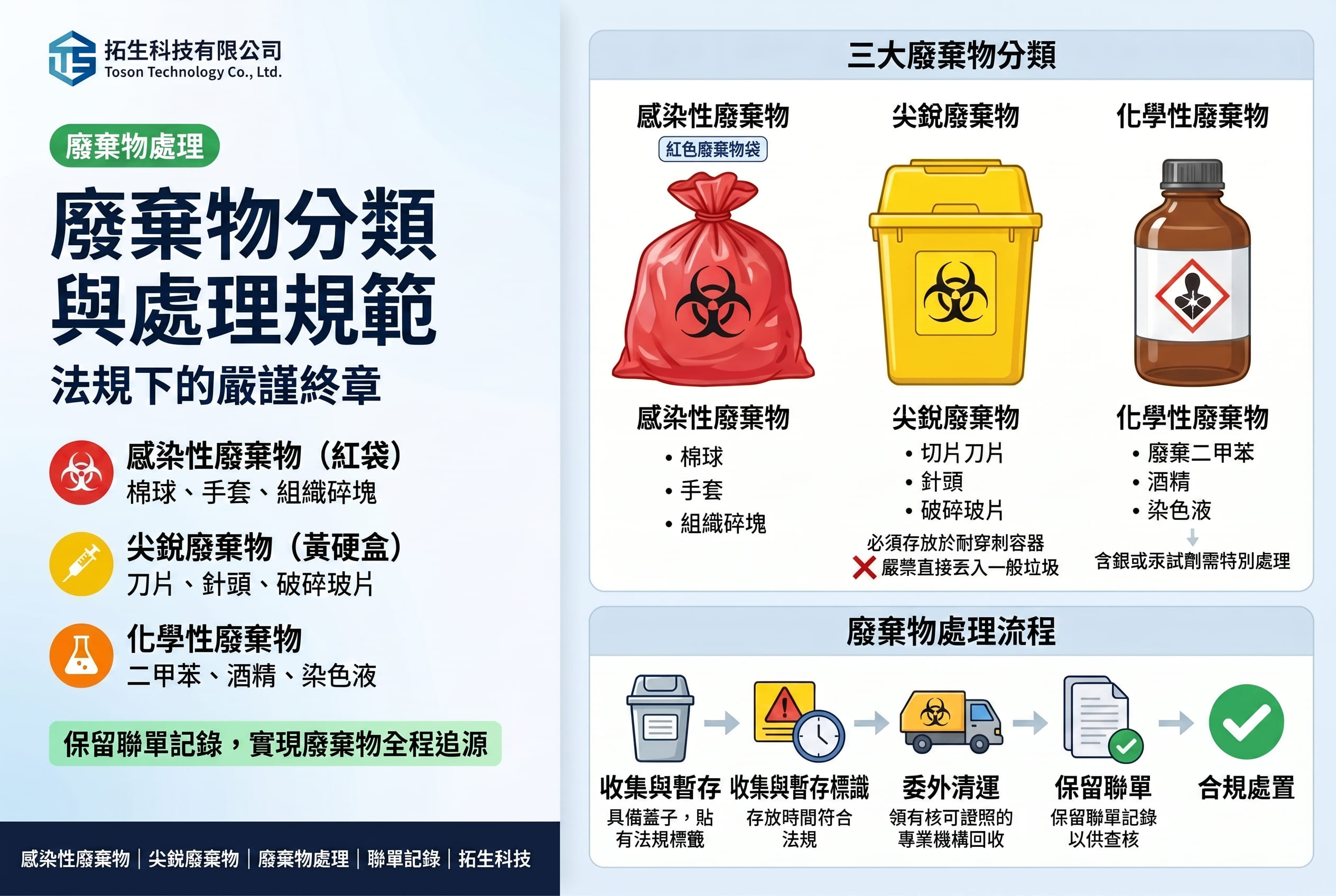 - 委外清運: 必須由領有核可證照的專業清除處理機構回收,且實驗室需保留聯單記錄以供查核。